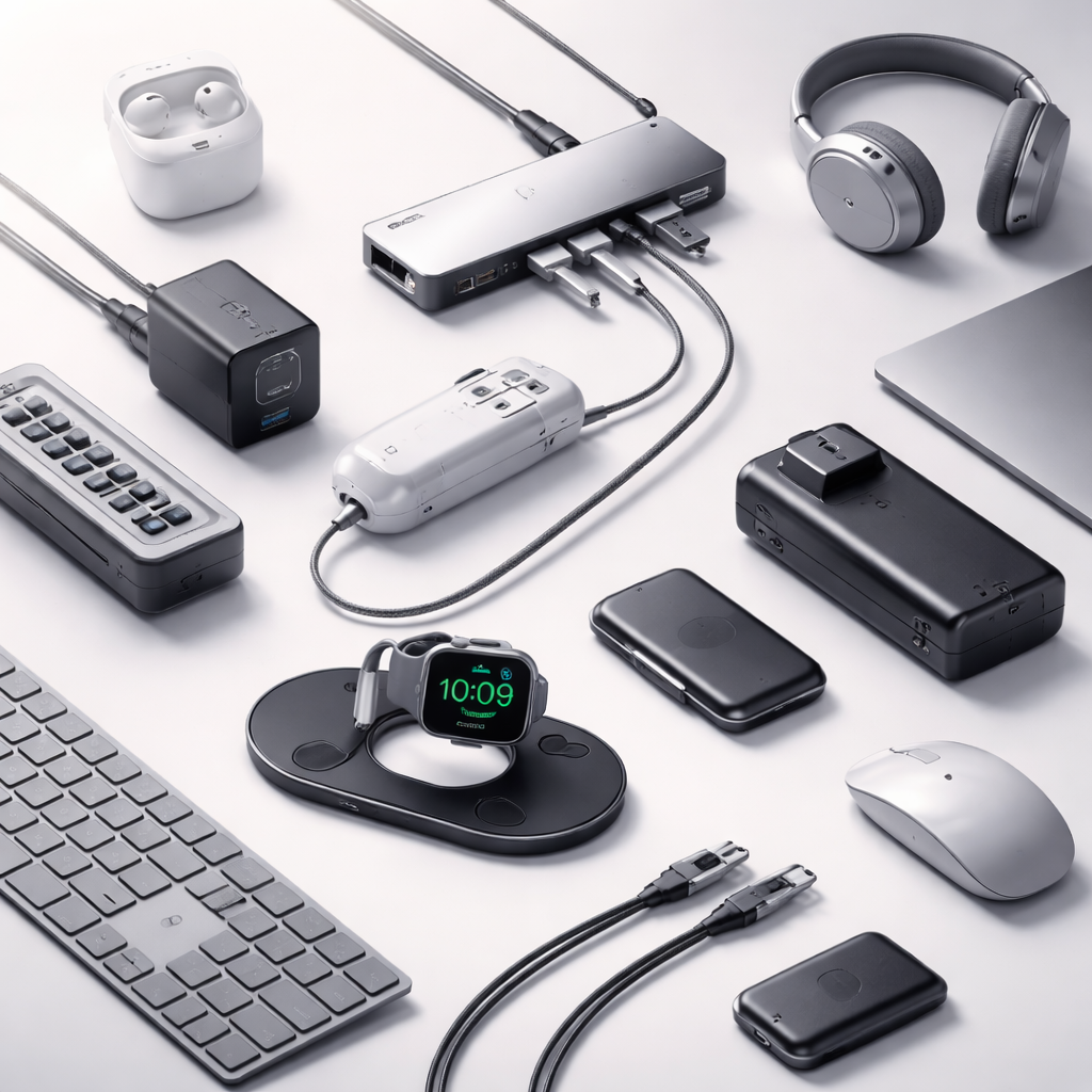 Computer keyboards, computer mouse, power cables, laptop and PC hubs, docks, headphones, gaming headphones, gaming keyboards,