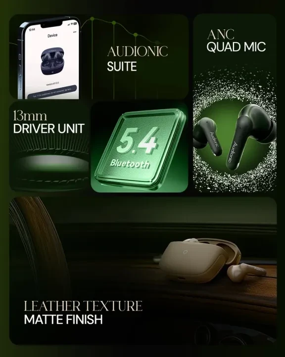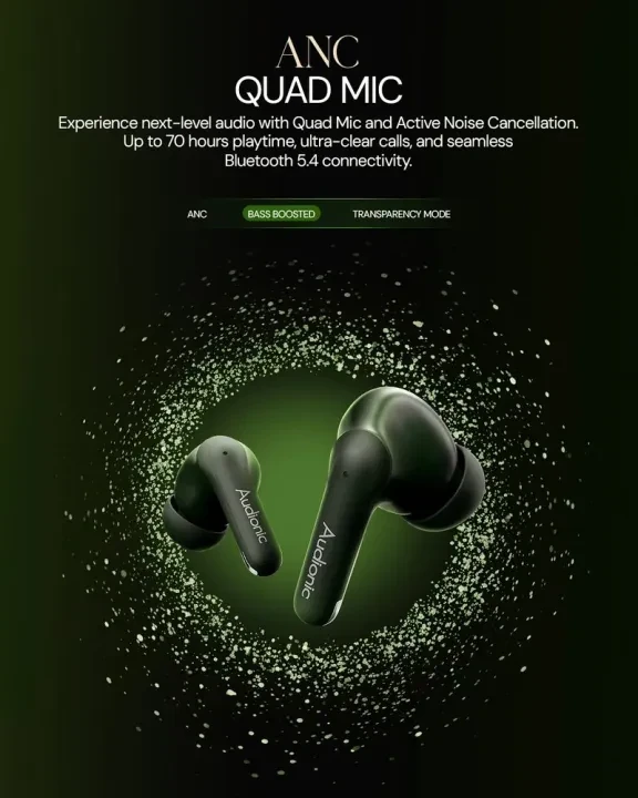 The **AUDIONIC AIRBUD740 (ION Series)** are next-generation wireless earbuds built for powerful sound, advanced Active Noise Cancellation (ANC), and ultra-long battery life. Featuring Quad Mic ANC calling, 13mm dynamic drivers, and up to 70 hours of total playtime, these earbuds are perfect for music lovers, gamers, and professionals alike.