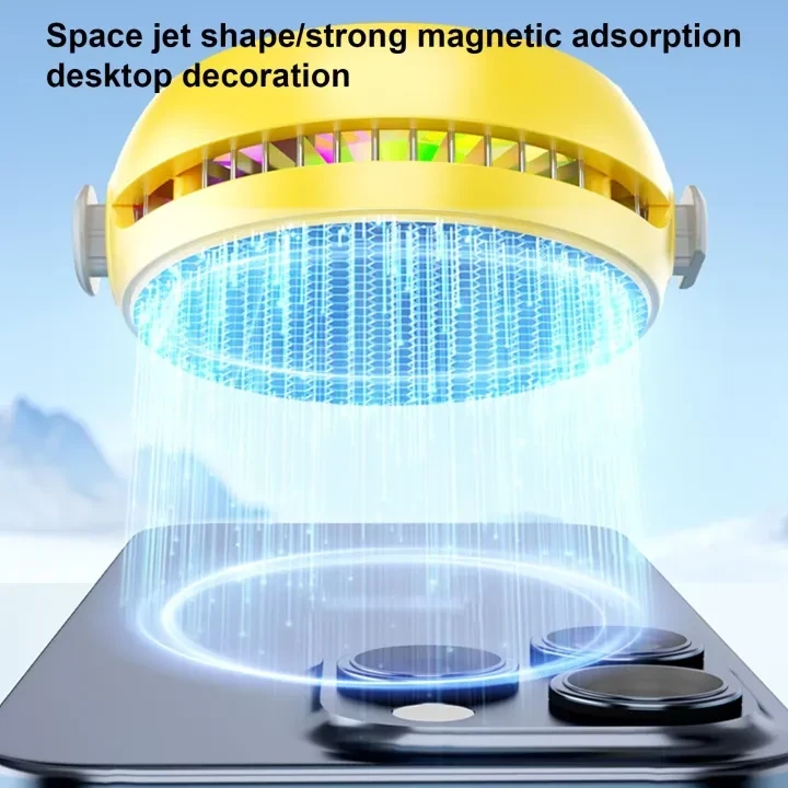 The A02 features a stylish **astronaut-themed design** with RGB lighting effects, making it both a functional cooler and a decorative desktop accessory. It is compatible with **iOS and Android smartphones**, tablets, and other devices, offering universal usability. Simply attach to the back of your device and connect the power cord to start cooling.