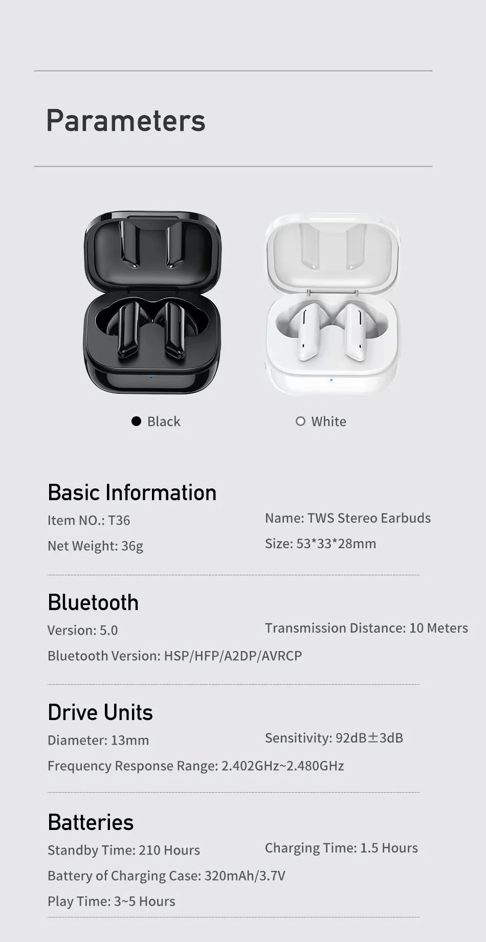 The AWEI T36 wireless earbuds should be your choice for their exceptional sound quality, great battery life, reliable connectivity, and comfortable, stylish design. The Bluetooth 5.0 technology ensures faster and more stable connections. The long battery life means you’re set for the whole day ahead. And all this comes in a compact, pocket-friendly charging case that goes wherever you do.