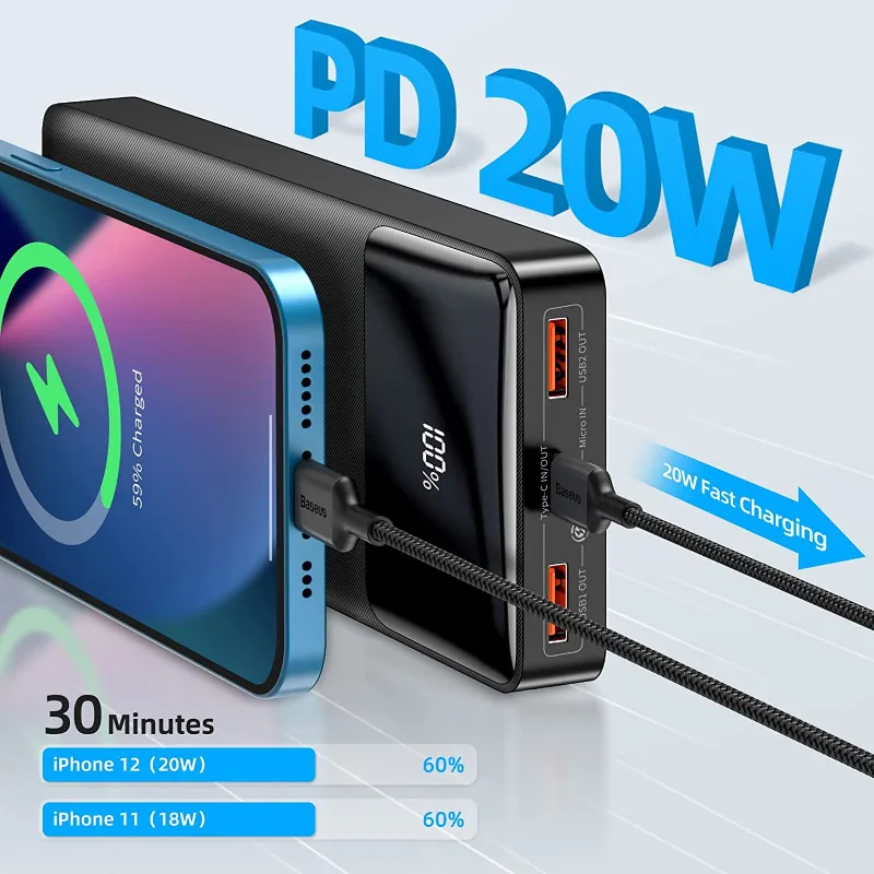 The Baseus Bipow Power bank is simple to use. To begin charging your device, connect it to the power bank using a USB cable and press the power button. You can monitor the charging status via the power bank’s digital display. Its slim and compact design means you can carry it in your backpack or handbag and charge your devices on-the-go. One full charge of the power bank can power up a standard smartphone up to 6 times, making it perfect for traveling, camping, commuting, and more.