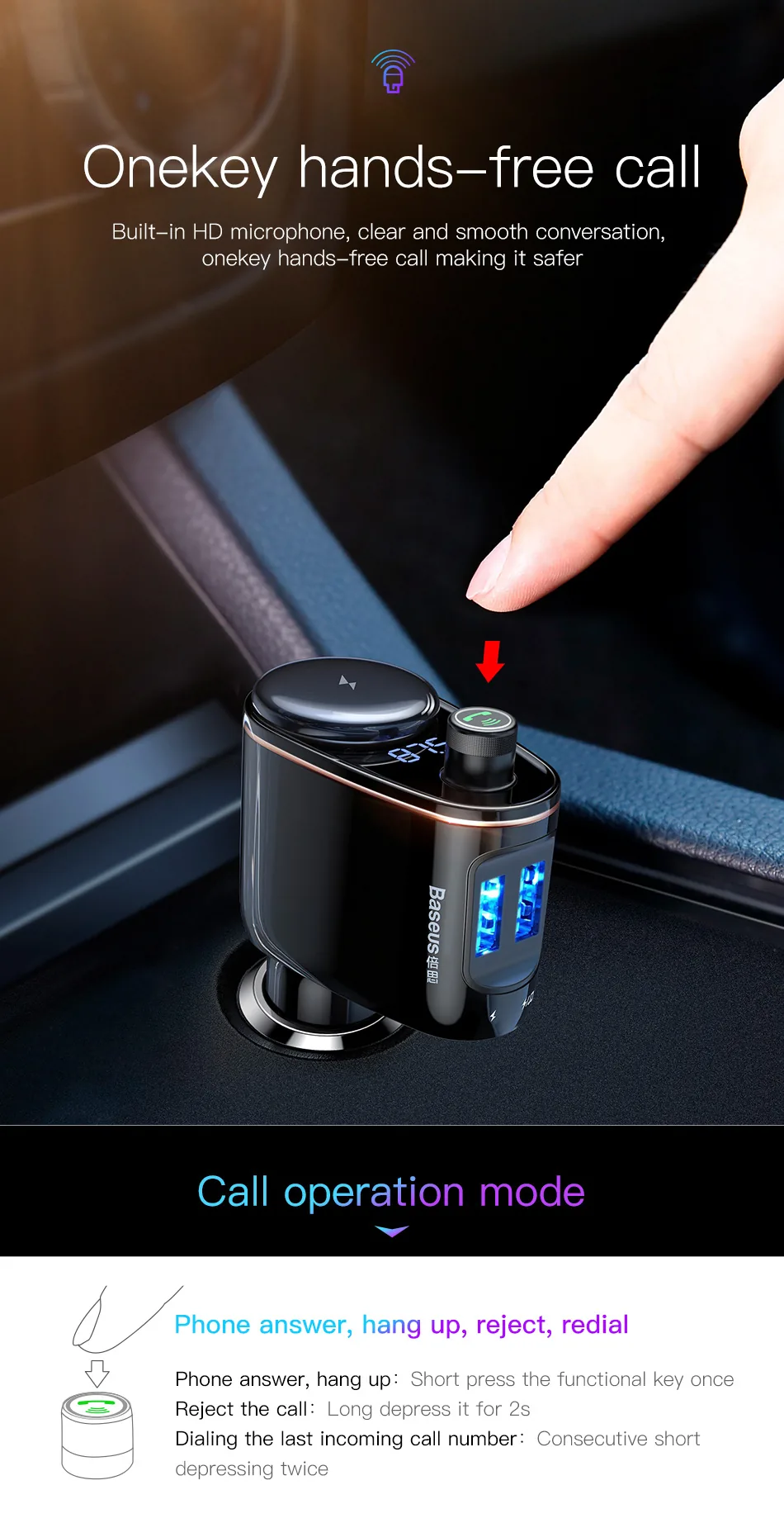 The Baseus Locomotive MP3 Wireless FM Modulator is designed to bring your vehicle’s audio system to life. The setup is incredibly simple. Plug the FM modulator into your car’s cigarette lighter socket. Connect your smartphone or U disk to the modulator through Bluetooth or USB and select your preferred FM channel on your car stereo. That’s all you need to do to stream your favorite music, podcasts or audiobooks right in your car. Enjoy hands-free phone calls and control your audio playback right from the modulator without touching your phone, ensuring a safe and enjoyable driving experience.