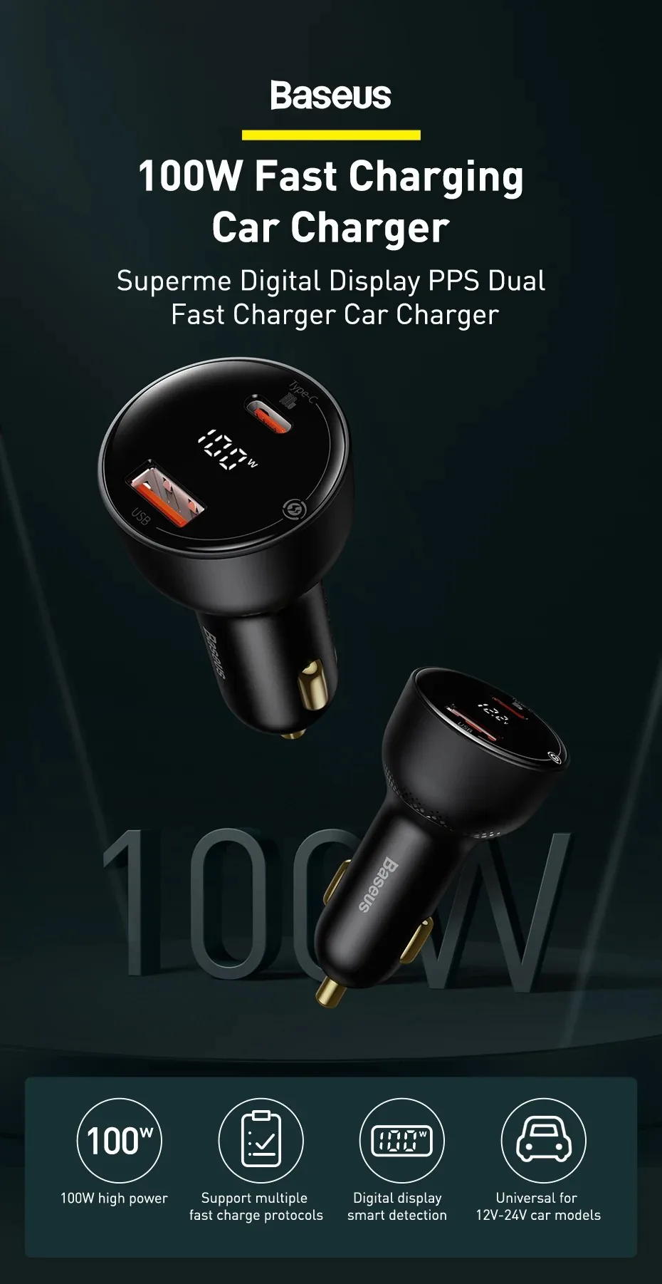 Introducing the Baseus Supreme 100W Car Charger with USB-C Cable – Your Ideal Fast Charging Companion on the Road!