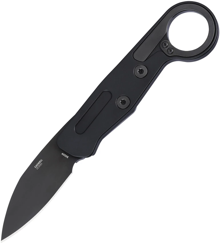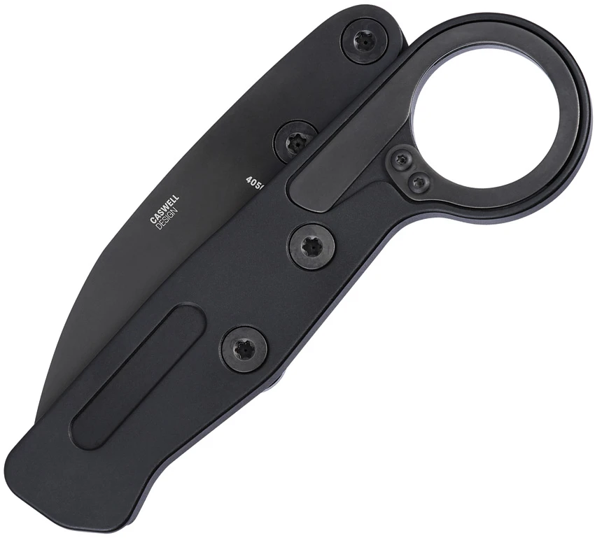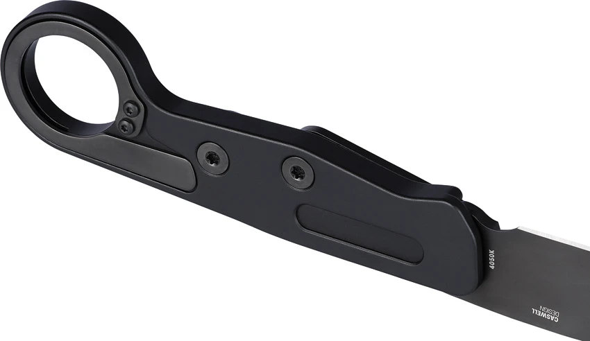 4.63″ (11.76cm) closed. 2.5″ (6.35cm) black finish D2 tool steel blade. Black aluminum handle. Finger ring. Flush mount clip for secure carry. Boxed.