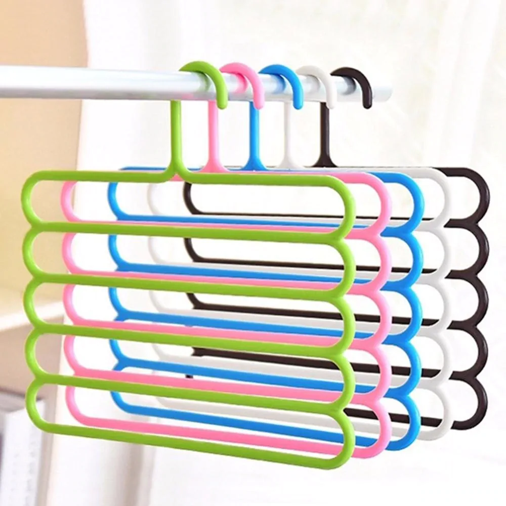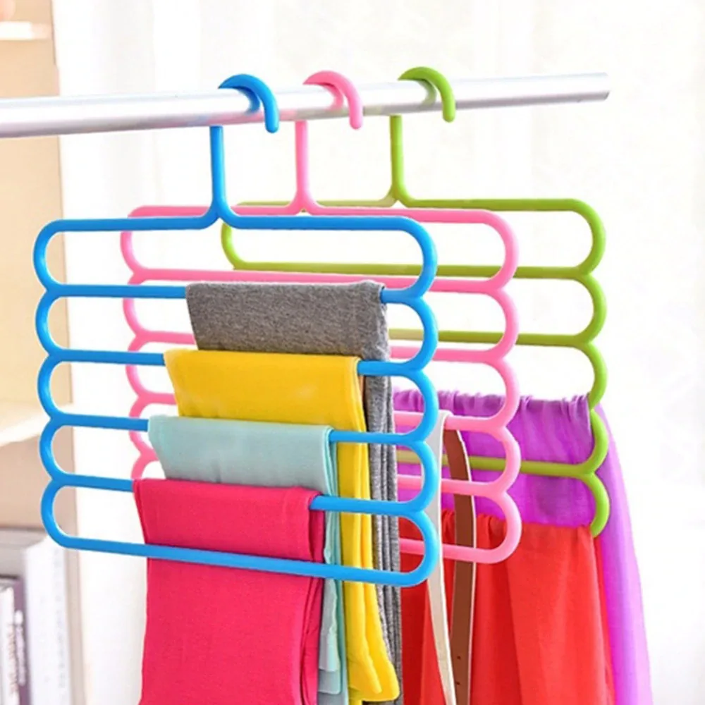 This five-layer trousers hanger is a hook-type, non-folding storage rack designed to maximize wardrobe space. Made from PP material, it holds pants, ties and similar garments and is available in multiple colors. The compact, vertical design lets you store several items on a single hanger to reduce clutter and improve closet organization.
