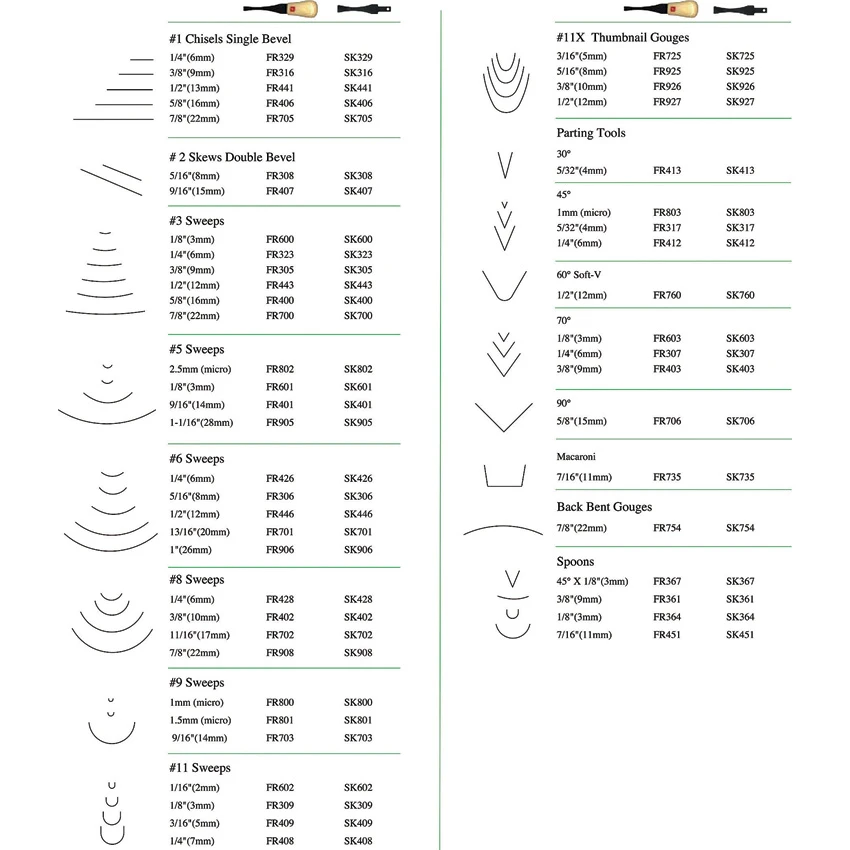 Includes (16) high carbon steel carving knives – SK406 #1 x 5/8″; SK407 #2 x 9/16″; SK323 #3 x 1/4″; SK700 #3 x 7/8″; SK601 #5 x 1/8″; SK446 #6 x 1/2″; SK428 #8 x 1/4″; SK402 #8 x 3/8″; SK702 #8 x 11/16″; SK703 #9 x 9/16″; SK602 #11 x 1/16″; SK725 #11X x 3/16″; SK927 #11X x 1/2″; SK317 45 deg. x 5/32″; SK403 70 deg. x 3/8″ and SK754 7/8″ Back Bent profiles; cutting knife; (2) Quick-Change handles (ABS and Power); SlipStrop with Gold polishing compound; instruction manual and 90m instructional DVD. Includes bonus band aid storage container with five standard sized band aids.