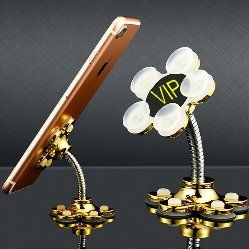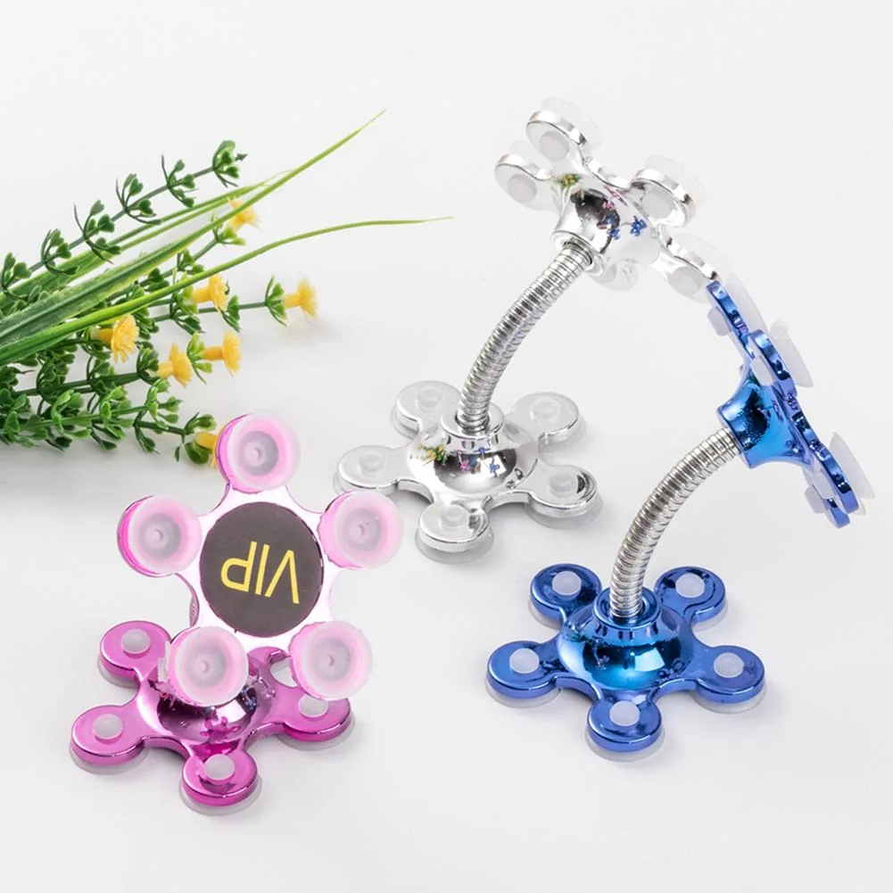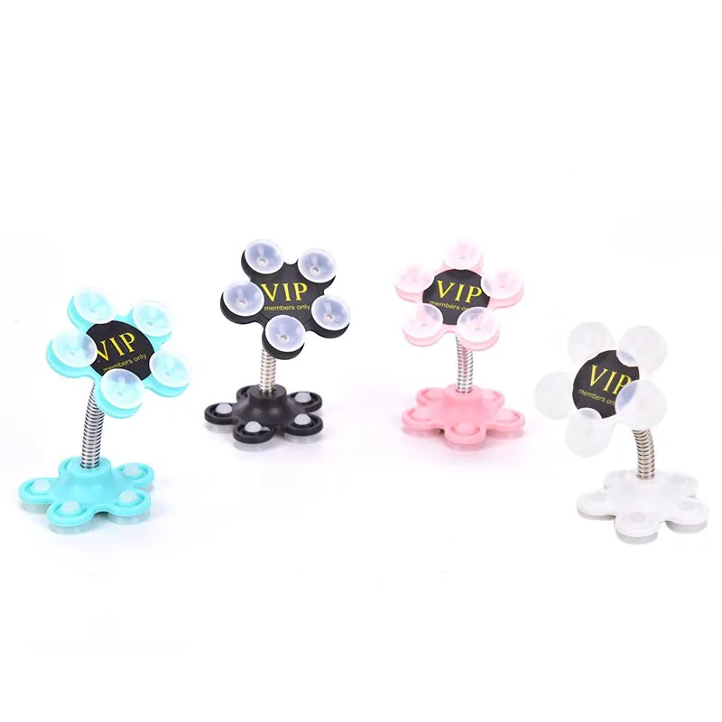 This compact flower-shaped phone holder features a 360-degree rotating head for flexible viewing angles and a small suction cup base for mounting on smooth surfaces. Constructed from alloy, ABS and silicone, it is suitable for household and car use where a compact, decorative mount is desired.