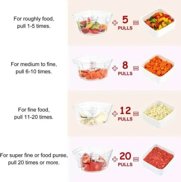 Overview : The Geedel Manual Pull Food Chopper is a hand-operated kitchen tool designed to quickly chop vegetables, fruits and nuts using a pull-cord mechanism.
