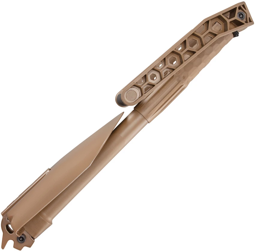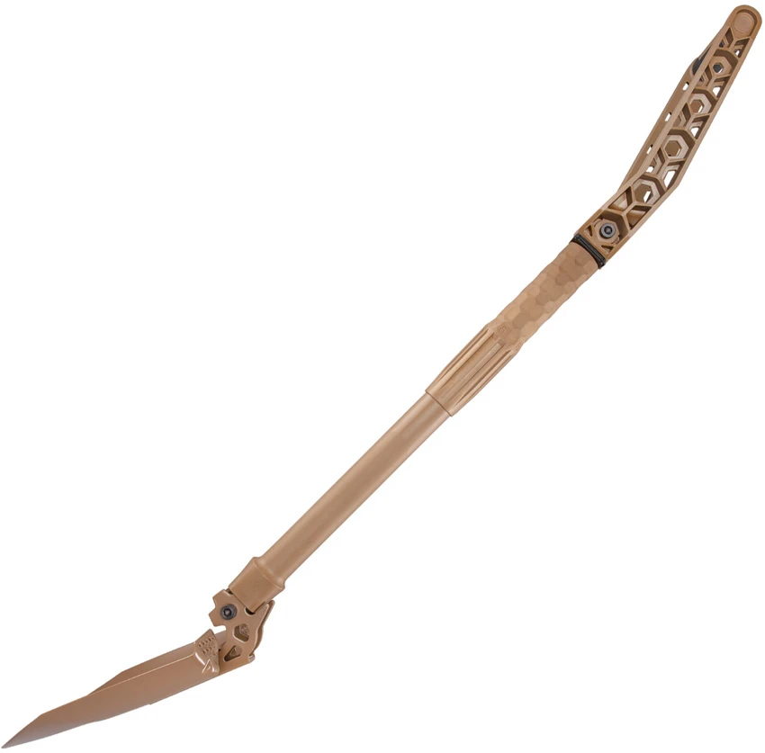 44.88″ overall. 25″ (63.5cm) closed. Tan rubberized polymer handle. Tan corrosion resistant finish heavy gauge steel blade. Three positions: open, closed, hoe. Boxed.