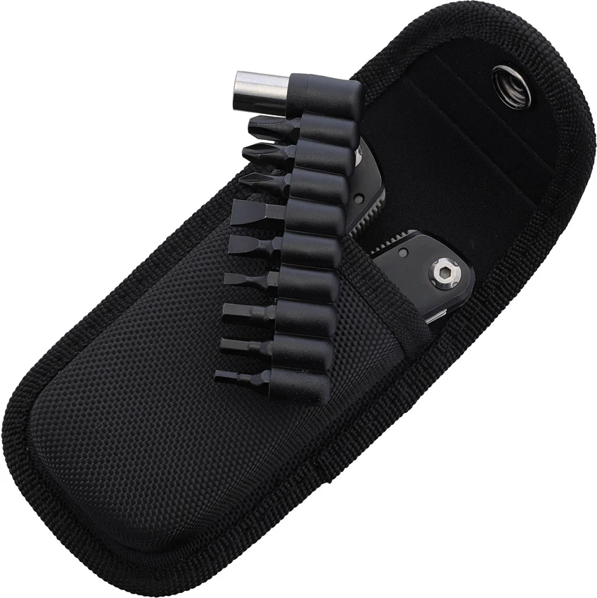 4.13″ closed. Black stainless handles. Tools include: Needlenose pliers l Wire cutter l Serrated blade l Flat head screwdriver l File l Ruler l Awl l Bottle opener l Can opener l Phillips screwdriver l Small blade. Magnetic bit holder with 9 assorted bits. Black nylon belt sheath. Stainless construction.