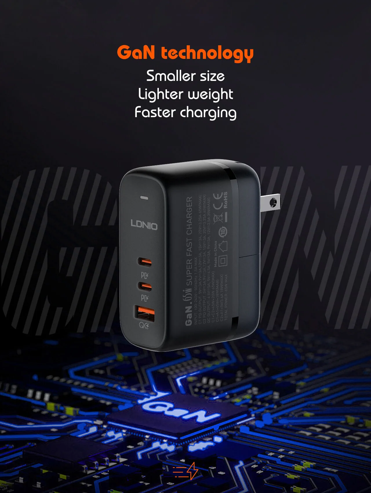 Buy LDNIO 65W 2C+U GaN Fast Charger with USB-C Cable Q366 available at ShoppersStop.pk Features: 65W GaN High Tech Fast Charger 3-Port USB (1A2C), PD (65W) + PD(65W) + QC (30W), total power 65W Replaceable Plug, US/EU/UK for option One charger for all, perfect for home and office High grade anti-fire PC material, prevent burning, safe to use. Support quick charge protocol including: BC1.2; PD3.0; PD2.0; PPS; QC4+; AFC; FCP,SCP,QC2.0,QC3.0 _____________________________________________________________ Buy LDNIO 65W 2C+U GaN Fast Charger with USB-C Cable Q366 available at ShoppersStop.pk Features: Features: 65W GaN High Tech Fast Charger 3-Port USB (1A2C), PD (65W) + PD(65W) + QC (30W), total power 65W Replaceable Plug, US/EU/UK for option One charger for all, perfect for home and office High grade anti-fire PC material, prevent burning, safe to use. Support quick charge protocol including: BC1.2; PD3.0; PD2.0; PPS; QC4+; AFC; FCP,SCP,QC2.0,QC3.0 _____________________________________________________________ 65W GaN High Tech Fast Charger 3-Port USB (1A2C), PD (65W) + PD(65W) + QC (30W), total power 65W Replaceable Plug, US/EU/UK for option One charger for all, perfect for home and office High grade anti-fire PC material, prevent burning, safe to use. Support quick charge protocol including: BC1.2; PD3.0; PD2.0; PPS; QC4+; AFC; FCP,SCP,QC2.0,QC3.0 65W GaN High Tech Fast Charger 3-Port USB (1A2C), PD (65W) + PD(65W) + QC (30W), total power 65W Replaceable Plug, US/EU/UK for option One charger for all, perfect for home and office High grade anti-fire PC material, prevent burning, safe to use. Support quick charge protocol including: BC1.2; PD3.0; PD2.0; PPS; QC4+; AFC; FCP,SCP,QC2.0,QC3.0 _____________________________________________________________