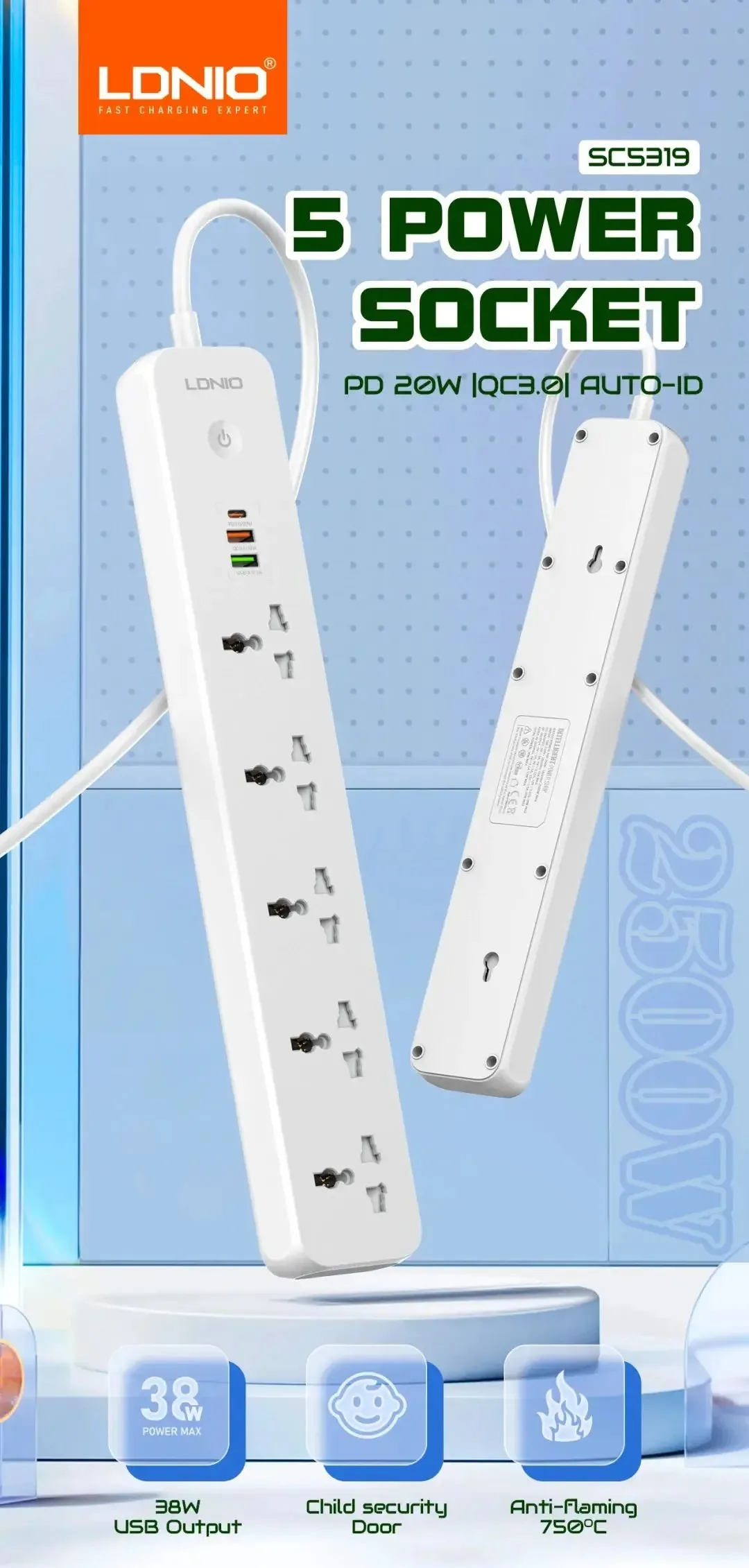 The LDNIO Defender Series Power Extension SC5319 aims at enriching your power supply setup not just by multiplying the outlets but also by adding a quotient of intelligent charging and superior safety. It is a high-quality power solution that comes with unprecedented features and a stylish design that complements your modern home or office set up. Enjoy the comfort and convenience of multi-device charging and power supply with this advanced power extension.