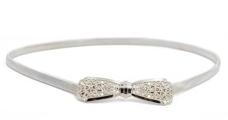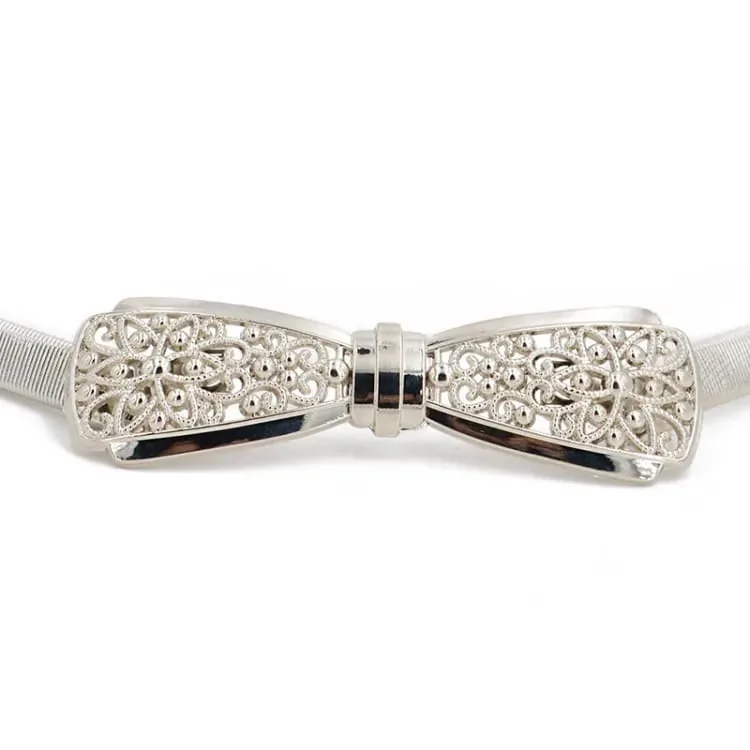 Place the belt around the high waist of a dress or skirt and adjust the stretch for a snug, comfortable fit. The metallic leaf design sits visibly at the front; pair with evening wear for weddings or with casual dresses to add a statement accessory.