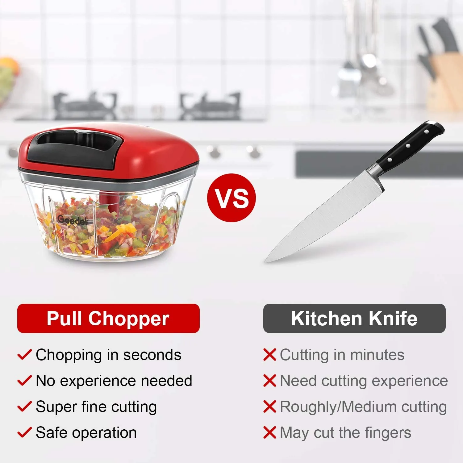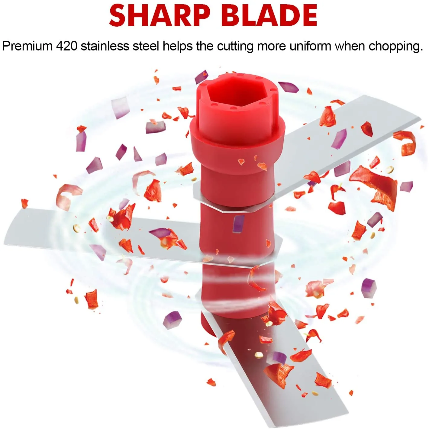 - Three stainless-style sharp blades inside for faster, consistent chopping with a few pulls of the string.