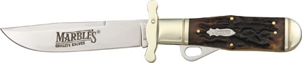 6 1/4″ closed. Stainless bowie style clip blade. Stag bone handles with Marbles shield. Grooved nickel silver bolsters. Folding guard. The blade on this knife is longer than the handle. The extended tang covers exposed blade end when knife is folded. Black leatherette zip up storage pouch.