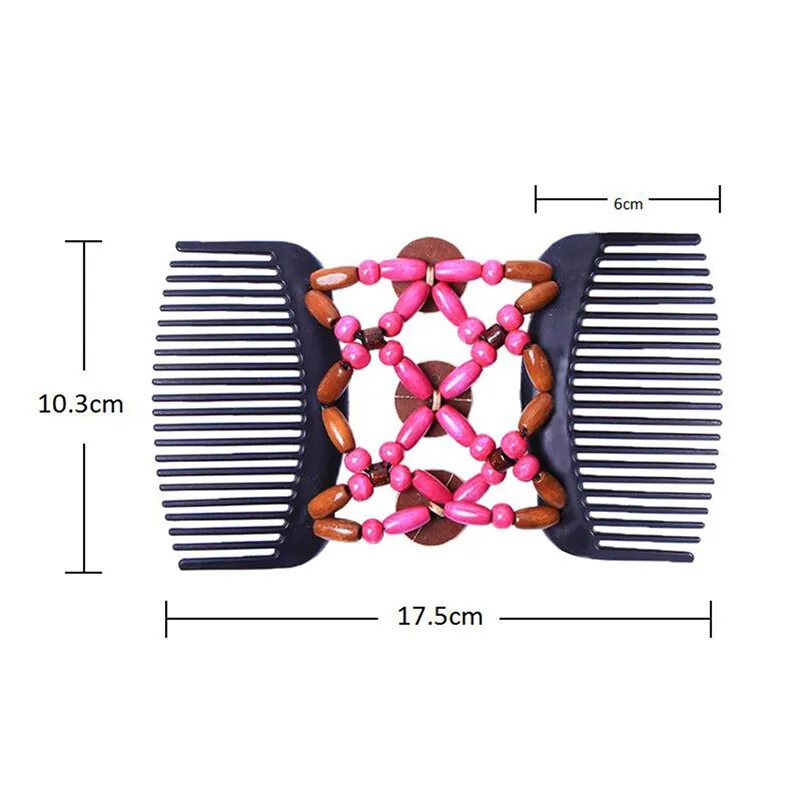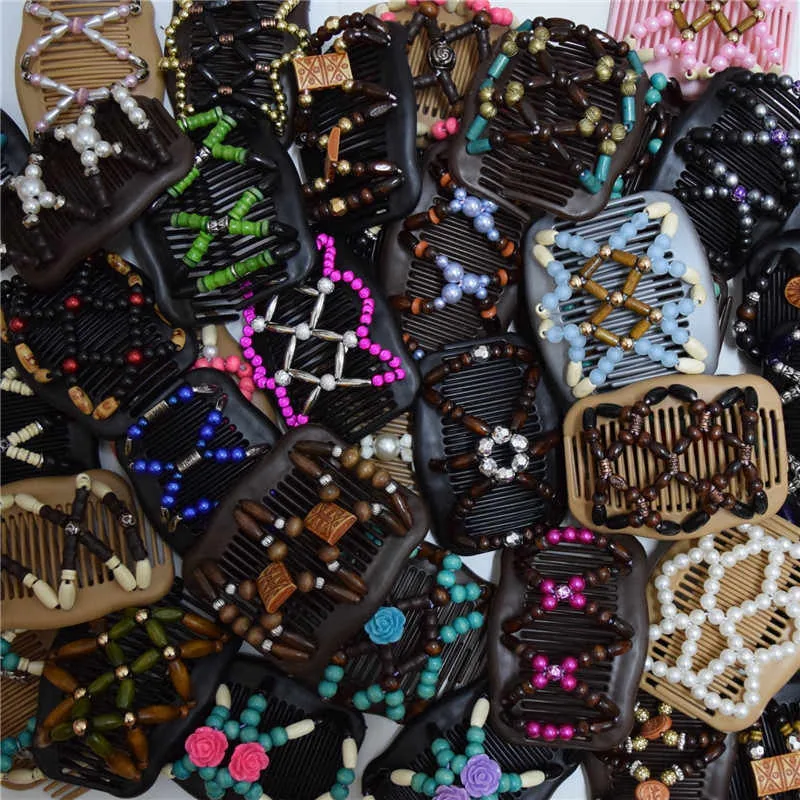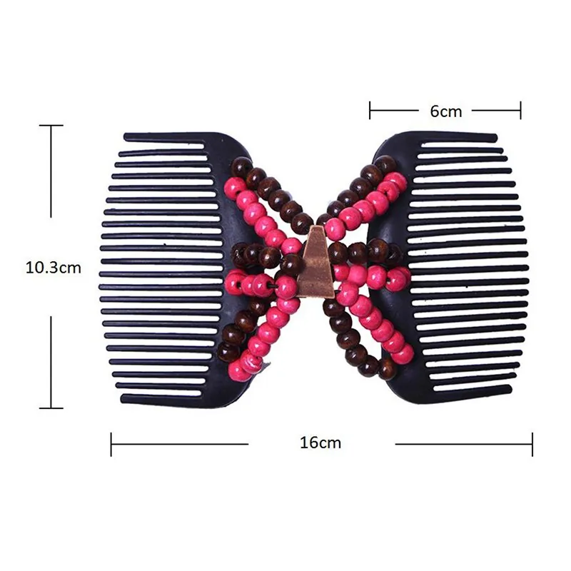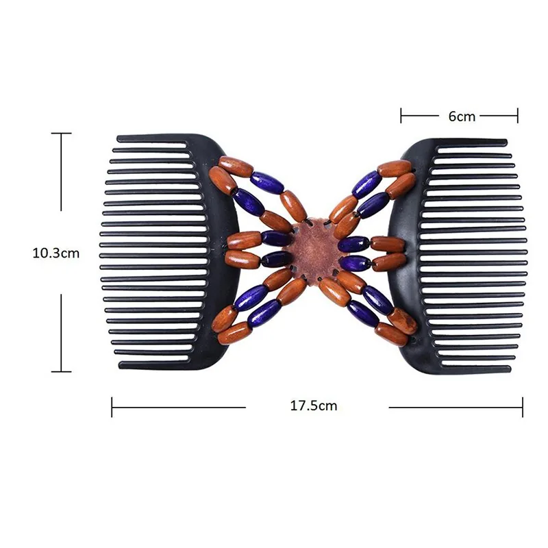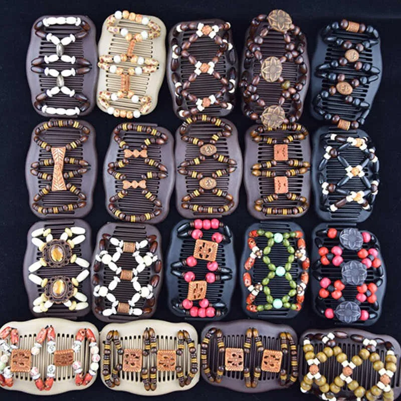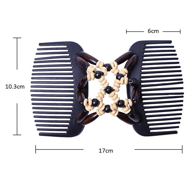 These retro-style double beaded comb clips are decorative hair accessories for casual occasions. The product is offered in wooden or plastic materials with a beaded appearance and is supplied as a single-piece package. Sizes are provided by style to suit different styling needs.