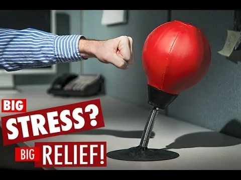 A compact desktop punching bag designed to provide a convenient stress-relief outlet at the office or home.