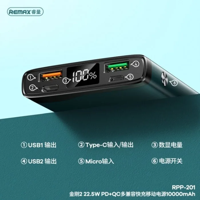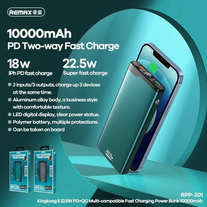 Buy REMAX Kingkong II QC 22.5W+PD 18W Multi Compatible PowerBank (RPP-201) available at ShoppersStop.pk 2 inputs/ 3 outputs, charge up 3 devices at the same time Aluminum alloy body, a business style wtih comfortable texture LED digital display, lear power status Polymer battery, multiple protections Can be taken on board MicroUSB input Type-C In/Output Dual USB Charging Ports 22.5W PD + QC Fast Charge Buy REMAX Kingkong II QC 22.5W+PD 18W Multi Compatible PowerBank (RPP-201) available at ShoppersStop.pk 2 inputs/ 3 outputs, charge up 3 devices at the same time Aluminum alloy body, a business style wtih comfortable texture LED digital display, lear power status Polymer battery, multiple protections Can be taken on board MicroUSB input Type-C In/Output Dual USB Charging Ports 22.5W PD + QC Fast Charge 2 inputs/ 3 outputs, charge up 3 devices at the same time Aluminum alloy body, a business style wtih comfortable texture LED digital display, lear power status Polymer battery, multiple protections Can be taken on board MicroUSB input Type-C In/Output Dual USB Charging Ports 22.5W PD + QC Fast Charge