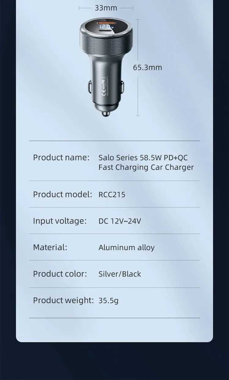 We sale 100% authentic REMAX Salo Series 58.5W PD+QC Fast Charging Car Charger (RCC215) by Remax.