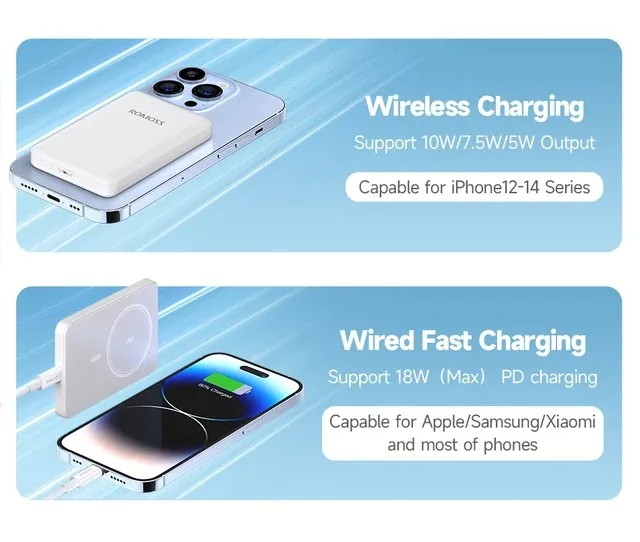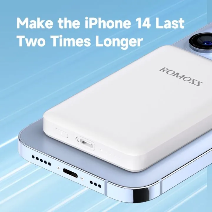 Buy ROMOSS Magnetic Power Bank Battery, 5000mAh Wireless Portable Charger with USB-C Cable, Compatible with MagSafe, iPhone 14/13/12 Series available at ShoppersStop.pk Buy ROMOSS Magnetic Power Bank Battery, 5000mAh Wireless Portable Charger with USB-C Cable, Compatible with MagSafe, iPhone 14/13/12 Series available at ShoppersStop.pk