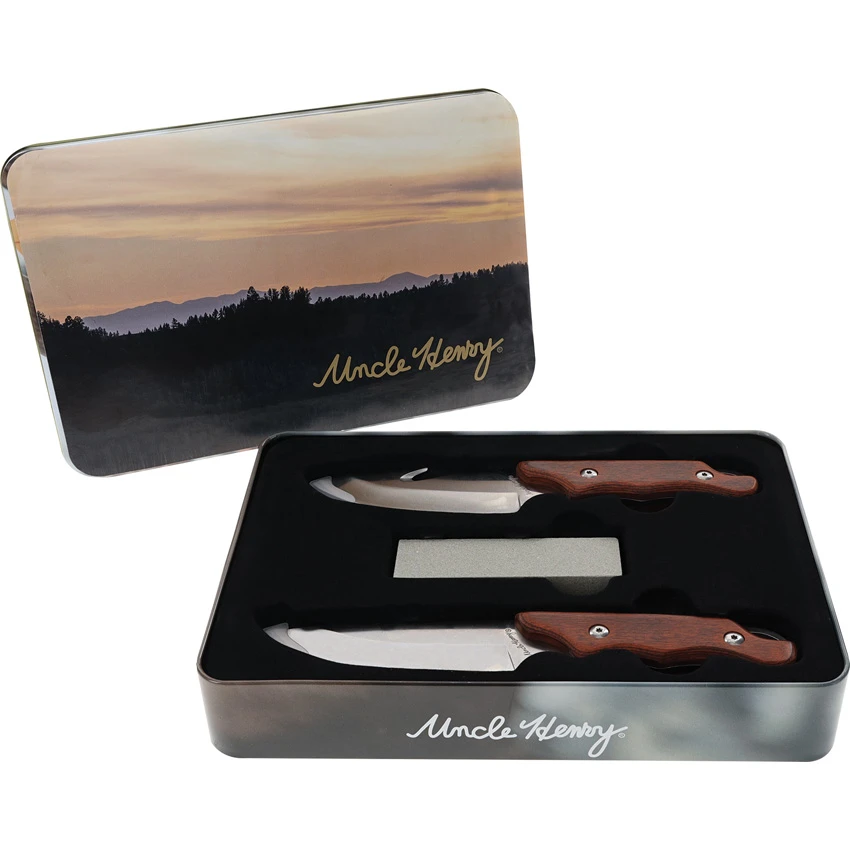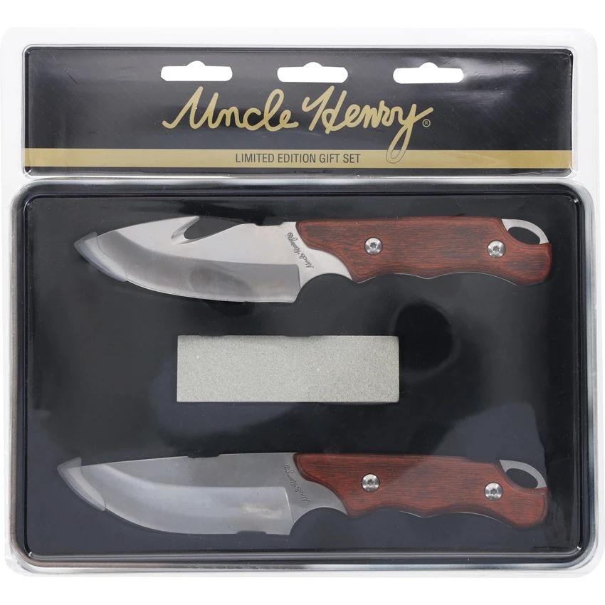 Uncle Henry. 7.75″ (19.69cm) overall. 3.5″ (8.89cm) satin finish stainless blade. Brown wood handle. Includes: Guthook and drop point; Sharpening stone; Gift tin. Clam packed.