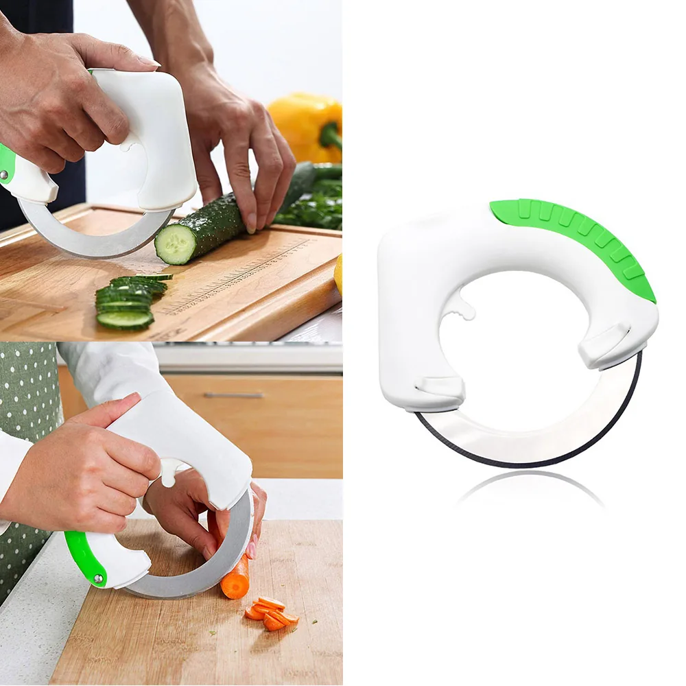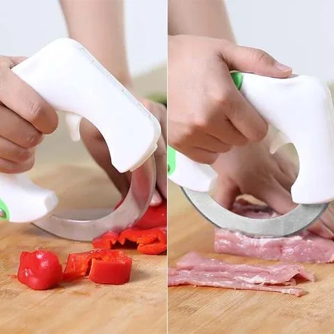 The rolling wheel kitchen knife is a stainless-steel circular blade designed for slicing fruits, vegetables, breads and cheeses with a rolling cutting motion.