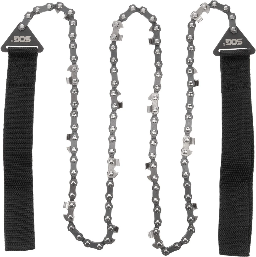 Black nylon handle. 36″ high-carbon steel chain with bi-directional cutting teeth. Black nylon pouch. Clam packed.