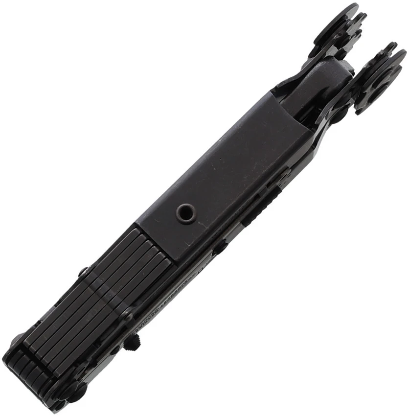 4 3/4″ closed. All stainless construction with black finish. Features one-handed flip opening and gear driven compound leverage for double the plier power. Standard and serrated edge S.A.T. assisted opening blades. Blades lock closed using patent pending side release mechanism. Components are now available that individually lock open with the patent pending Piano-Locks. Other components include needlenose pliers with wire cutters, three sided file, large screwdriver, Phillips screwdriver, can opener with small screwdriver, bottle opener with medium screwdriver, wire crimper, blast cap crimper and V-Cutter. Handles feature standard and metric measurement. Nylon belt sheath. Hang packaged.