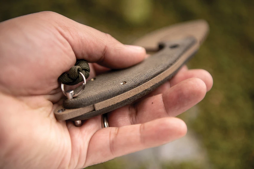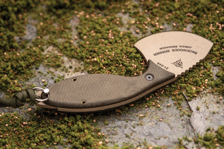 6 3/4″ overall. 2 7/8″ coyote tan finish 1095 high carbon steel deep bellied skinning blade. Full tang. Green canvas micarta handles with deep finger choil and ovulated grips. Lanyard hole. Pommel features a grenade pin with OD green nylon cord and keyring holding in place a 2 3/4″ overall parasite guthook skinner hidden inside the handle. Black leather belt sheath with OD green nylon cord and TOPS survival whistle. Certificate of Authenticity. Instructions on using the knife as a guthook. Bulk packed. Designed by Joshua Swanagon.