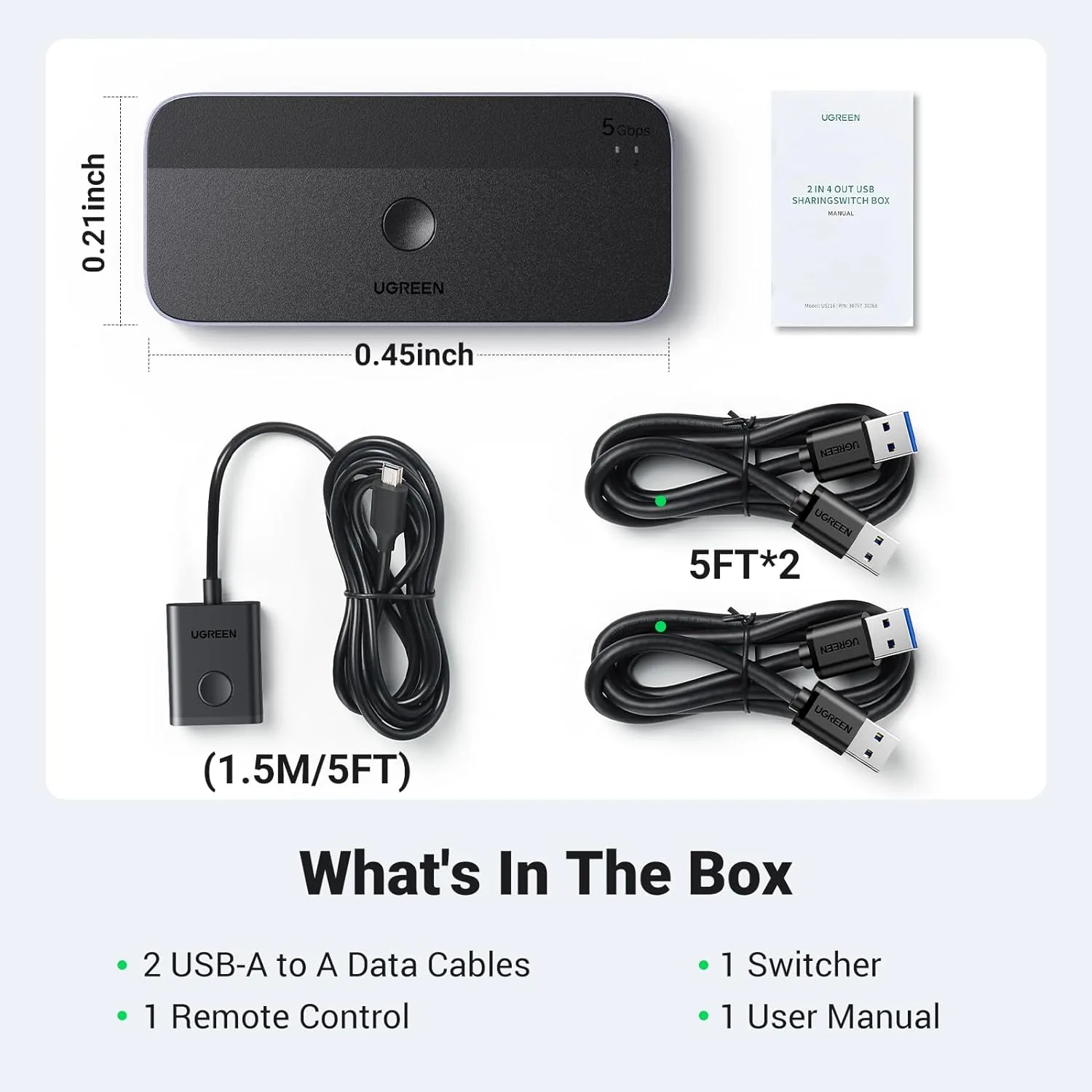 Packed with an abundance of features, the UGREEN USB 3.0 4-Port Switch With 2 Pack USB Male Cable 15705 provides more than what meets the eye. It is not just a product, but a delightful blend of speed, safety, compatibility, and convenience. A small, yet mighty ally for your workspace or home, enhancing productivity and easing everyday digital life. Choose UGREEN USB 3.0 4-Port Switch, choose superior connectivity!