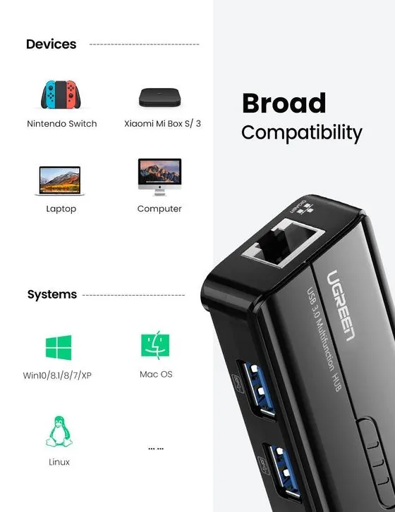 Buy Ugreen USB 3.0 Hub with Gigabit Ethernet Adapter 20265 available at ShoppersStop.pk Features: Support Max 1000Mbps: This LAN network adapter offers full 10/100/1000 Mbps Fast Ethernet performance over USB 3.0 and Ethernet ports, faster and more reliable than most wireless connections. 3-Port USB 3.0 hub rate up to 5Gbps: This USB hub Ethernet adapter Simply helps you to connect up to 3 USB A devices to your PC or laptop, such as external hard Drive, USB Flash Drive, mouse, keyboard, USB headphone, speakers, USB webcam etc. Extra Power Supply: Dc-jack designed for power supply to this product when connecting USB HDD. Please kindly note: This product only works with DC 5V (center positive Polarity) adapter for power supply. Buy Ugreen USB 3.0 Hub with Gigabit Ethernet Adapter 20265 available at ShoppersStop.pk Features: Support Max 1000Mbps: This LAN network adapter offers full 10/100/1000 Mbps Fast Ethernet performance over USB 3.0 and Ethernet ports, faster and more reliable than most wireless connections. 3-Port USB 3.0 hub rate up to 5Gbps: This USB hub Ethernet adapter Simply helps you to connect up to 3 USB A devices to your PC or laptop, such as external hard Drive, USB Flash Drive, mouse, keyboard, USB headphone, speakers, USB webcam etc. Extra Power Supply: Dc-jack designed for power supply to this product when connecting USB HDD. Please kindly note: This product only works with DC 5V (center positive Polarity) adapter for power supply.
