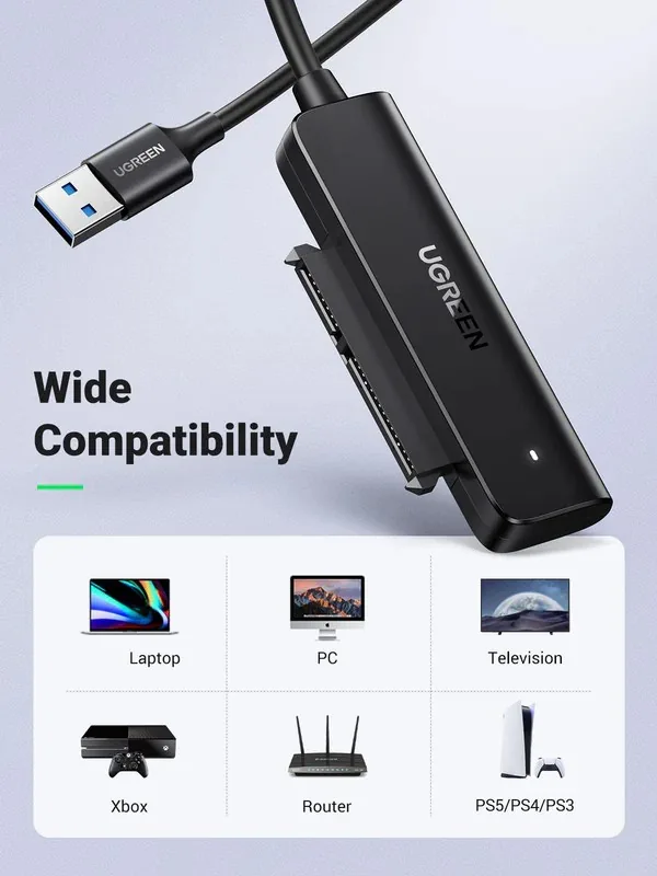 - Wide compatibility: From laptops, desktops, and all the way to 2.5/3.5-inch SATA HDD/SSD, the UGREEN USB 3.0 to SATA adapter is designed to work with a plethora of devices.