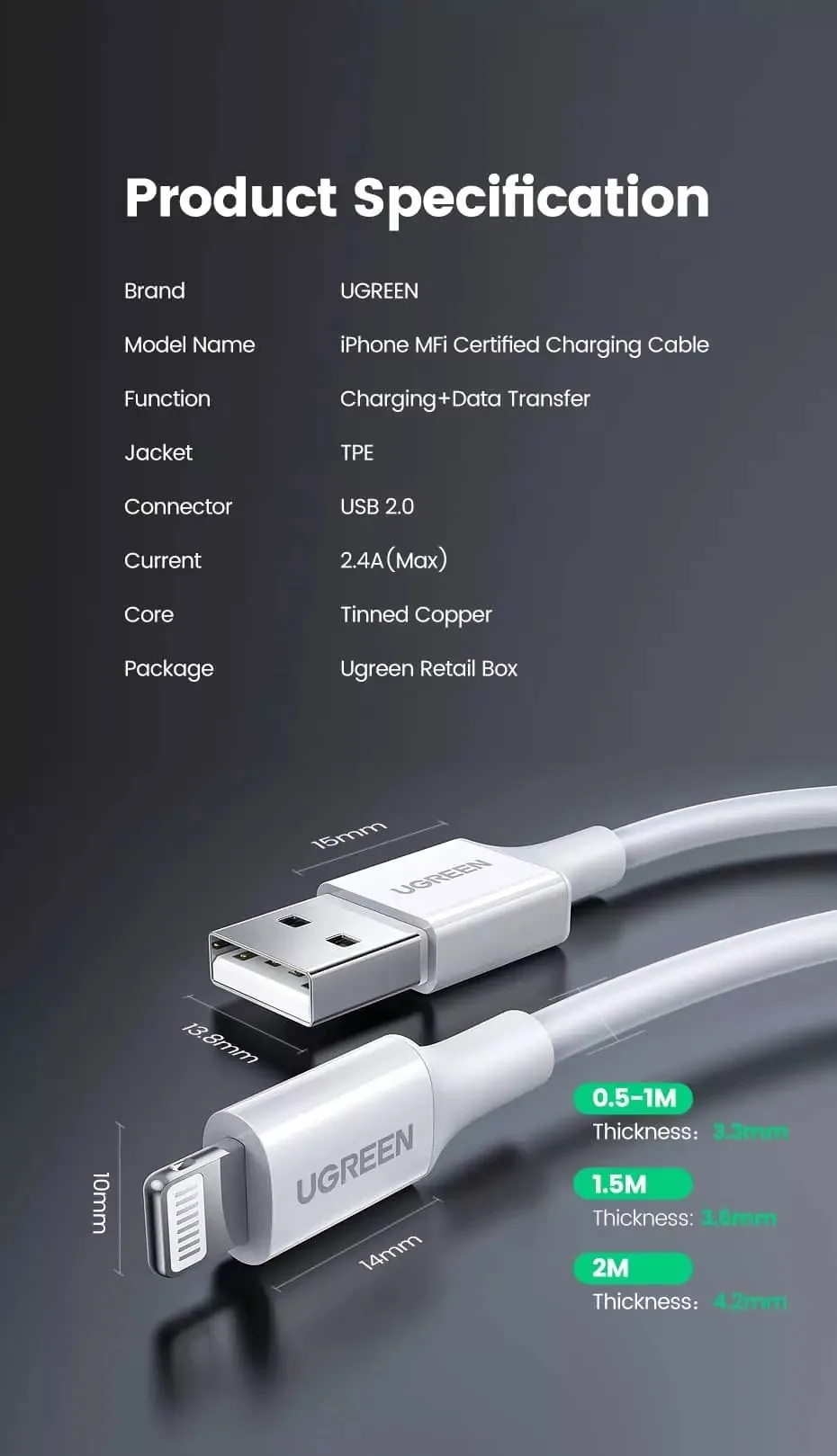 - Fast Charging: Experience speedy and efficient charging with the Ugreen USB-A to Lightening Cable 20728.