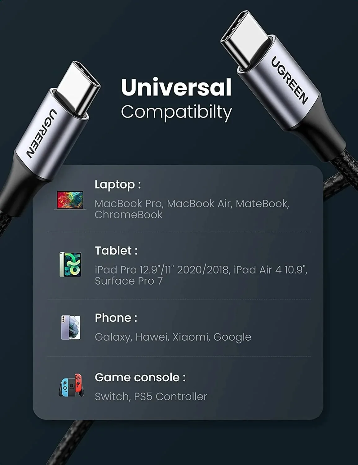 Buy Ugreen USB-C 2.0 Male To USB-C 2.0 Male 3A Data Cable 50152 available at ShoppersStop.pk UGREEN USB-C to USB-C Cable supports upto 60W of Charging. With extended length of 6 feet, you can charger your Macbook at max speed of 60W with ease with this cable. This is braided by Nylon Fiber to ensure long lasting life. 60W USB C Cable: This cable can charges your phones, tablets, laptops and other C-Port devices at high speed by using 60W 45W 18W USB-C Power Adapters. Note: This is a Type-C to Type-C cable not USB-C to USB-A, the both ends are Type-C Connector. Fast Charging & Sync: Output power up to 20V/3A, suports max 60W Power Delivery PD fast charging, QC3.0. Offers transfer speed up to 480Mbps (USB 2.0), or 100 songs every 5 seconds. 【This USB C cable can not support video output.】 Premium Quality: Solid and durable nylon braided cable ensures longer service life up to 10,000 bend. Double-sided USB C connectors with overmolded strain relief designed for frequent insertions. Aluminum housing, high-purity copper wire, triple-shielding will keep long-lasting fast charging performance. Buy Ugreen USB-C 2.0 Male To USB-C 2.0 Male 3A Data Cable 50152 available at ShoppersStop.pk UGREEN USB-C to USB-C Cable supports upto 60W of Charging. With extended length of 6 feet, you can charger your Macbook at max speed of 60W with ease with this cable. This is braided by Nylon Fiber to ensure long lasting life. 60W USB C Cable: This cable can charges your phones, tablets, laptops and other C-Port devices at high speed by using 60W 45W 18W USB-C Power Adapters. Note: This is a Type-C to Type-C cable not USB-C to USB-A, the both ends are Type-C Connector. Fast Charging & Sync: Output power up to 20V/3A, suports max 60W Power Delivery PD fast charging, QC3.0. Offers transfer speed up to 480Mbps (USB 2.0), or 100 songs every 5 seconds. 【This USB C cable can not support video output.】 Premium Quality: Solid and durable nylon braided cable ensures longer service life up to 10,000 bend. Double-sided USB C connectors with overmolded strain relief designed for frequent insertions. Aluminum housing, high-purity copper wire, triple-shielding will keep long-lasting fast charging performance. 60W USB C Cable: This cable can charges your phones, tablets, laptops and other C-Port devices at high speed by using 60W 45W 18W USB-C Power Adapters. Note: This is a Type-C to Type-C cable not USB-C to USB-A, the both ends are Type-C Connector. Fast Charging & Sync: Output power up to 20V/3A, suports max 60W Power Delivery PD fast charging, QC3.0. Offers transfer speed up to 480Mbps (USB 2.0), or 100 songs every 5 seconds. 【This USB C cable can not support video output.】 Premium Quality: Solid and durable nylon braided cable ensures longer service life up to 10,000 bend. Double-sided USB C connectors with overmolded strain relief designed for frequent insertions. Aluminum housing, high-purity copper wire, triple-shielding will keep long-lasting fast charging performance.