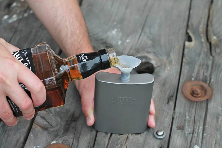 Patent pending integrated silicone funnel is always right where you need it. Simply flip it up for easy filling, then fold it down to sip comfortably. Titanium flask holds your favorite drink while imparting no taste, odor, or chemicals meaning you and your single malt stay pure. The funnel also functions as a perfect spout to pour your alcohol back into its original container. Specifications: Capacity: 8 oz (240 ml). Weight: 3.7 ounces (105 grams). Length: 5.9 inches (150 mm). Width: 3.7 inches (94 mm).